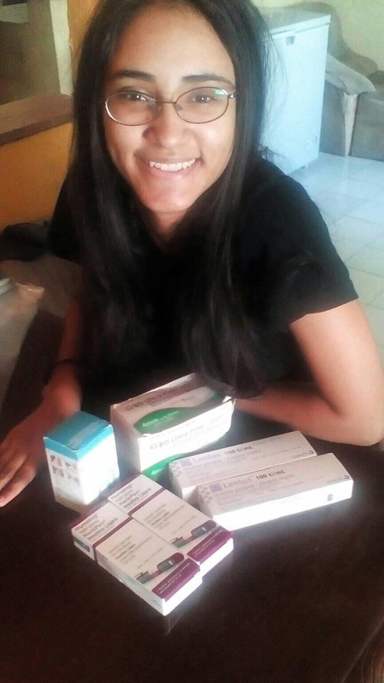 Apartando la política, mi punto específicamente es el de la medicina para mi hija mayor, Alejandra Rodríguez con tan solo 19 años, estudiante de arte en la Universidad del Zulia, padece de Diabetes Mellitus tipo I (insulino dependiente), requiere de dos insulinas al día para vivir, la Apidra que se la inyecta antes de cada comida y la Lantus que se la inyecta en la noche antes de dormir.