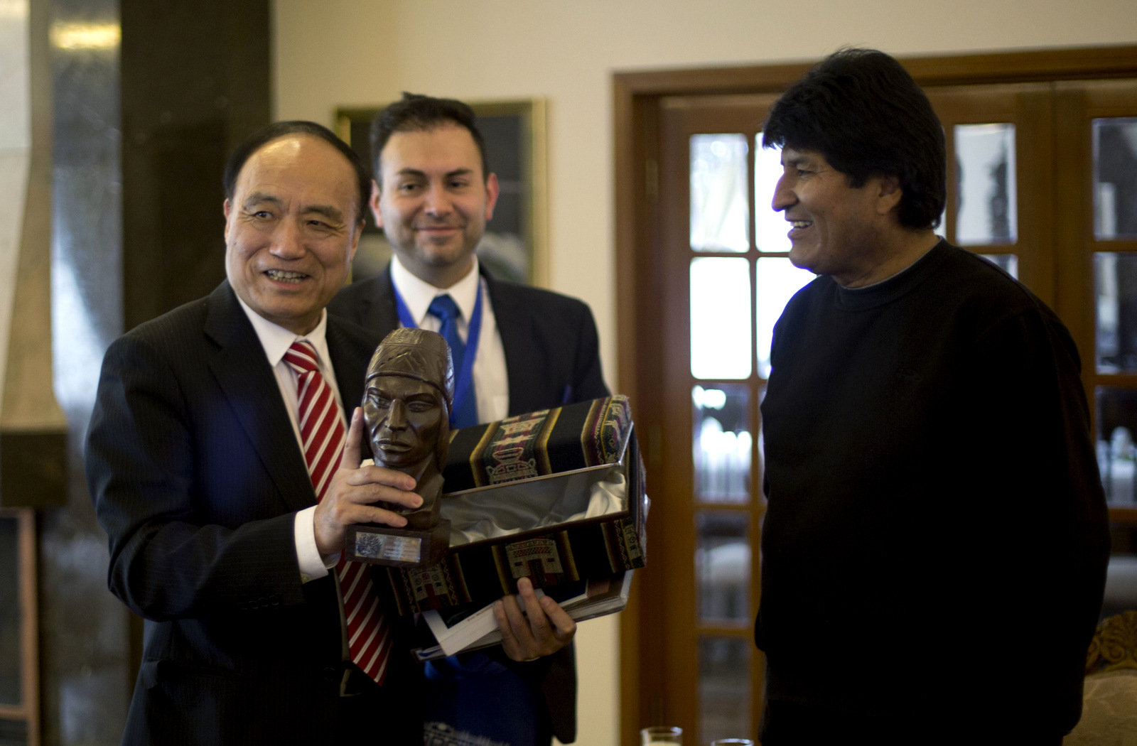 Bolivia's President Evo Morales, right, gives a handcrafted bust of Bolivia's indigenous leader Tupac Katari to Houlin Zhao, left, from China, Secretary General of the International Telecommunication Union, ITU, during a meeting at the presidential residence, in La Paz., Oct. 13, 2017. (AP/Juan Karita)