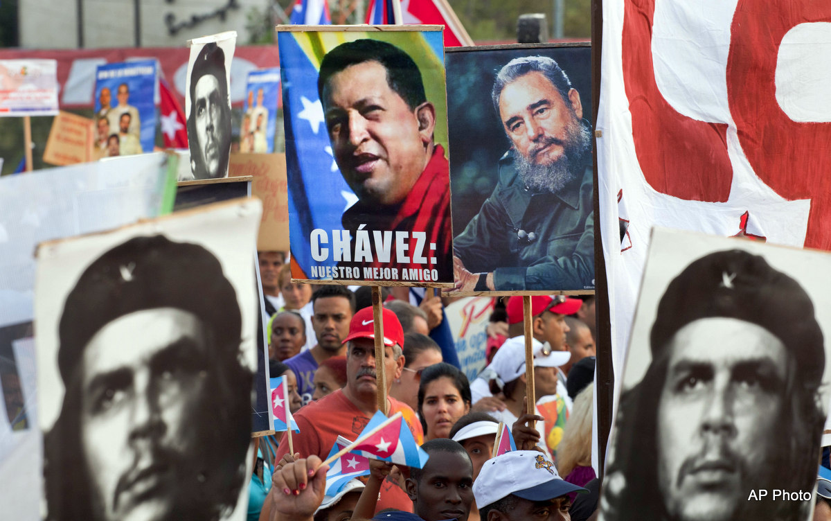 People hold up images showing Fidel Castro, second from right, Venezuela's late President Hugo Chavez, center, and Cuba's revolutionary hero Ernesto 'Che' Guevara, bottom left and right, during a May Day march in Revolution Square in Havana, Cuba, Wednesday, May 1, 2013. The image of Chavez carries the words in Spanish "Chavez : Our best friend." (AP Photo/Ramon Espinosa)