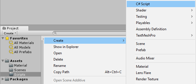 Para esto tenemos que crear un código de C#, esto lo haremos haciendo clic secundario en la carpeta assets, opcion Create → C# Script y lo nombramos, por ejemplo, Player.