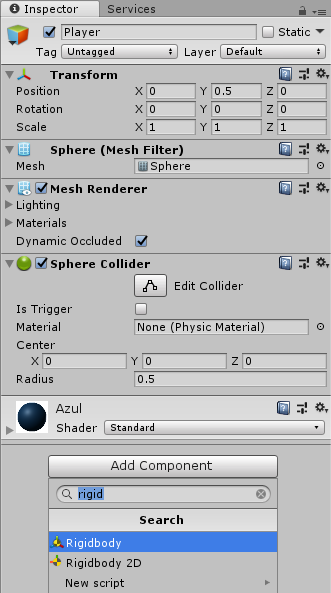 Para hacerlo, desde el inspector, hacemos clic en Add Component → Rigidbody.