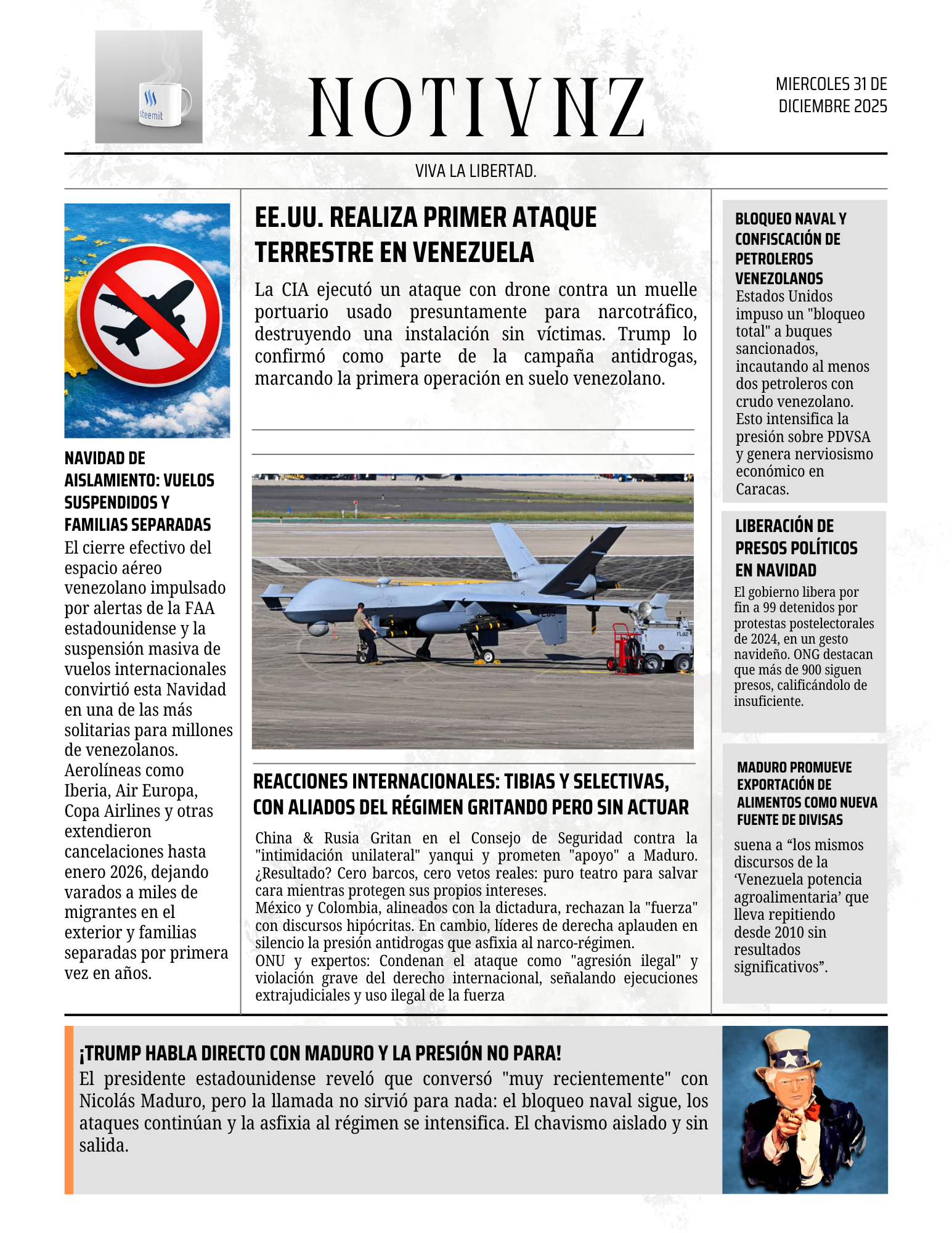 La CIA ejecutó un ataque con drone contra un muelle portuario en la costa venezolana, presuntamente usado por el Tren de Aragua para cargar drogas. Sin víctimas reportadas, pero Trump lo confirmó públicamente como un "golpe duro" a una "gran instalación". Es la primera operación conocida en suelo venezolano, escalando de los ataques navales (más de 30 embarcaciones destruidas) a strikes terrestres. Maduro guarda silencio total, exponiendo su incapacidad para responder.