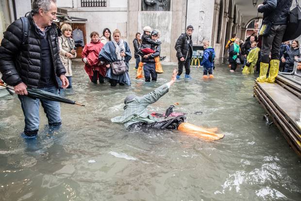 Venice frequently floods when high winds push in water from the lagoon, but Monday’s levels were exceptional. The peak level was the highest reached since December 2008, according to Venice statistics.