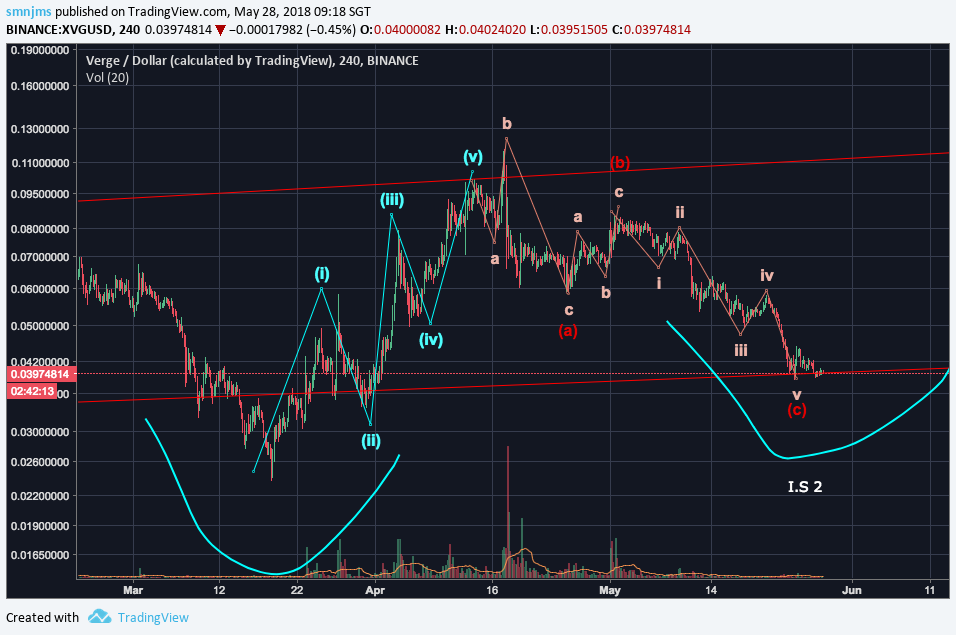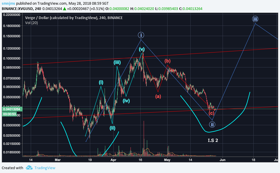 This is my primary count. Although should we decisively break the lower trend line holding is1 and is2 and breach a price of $0.024 this count will be rendered invalid.