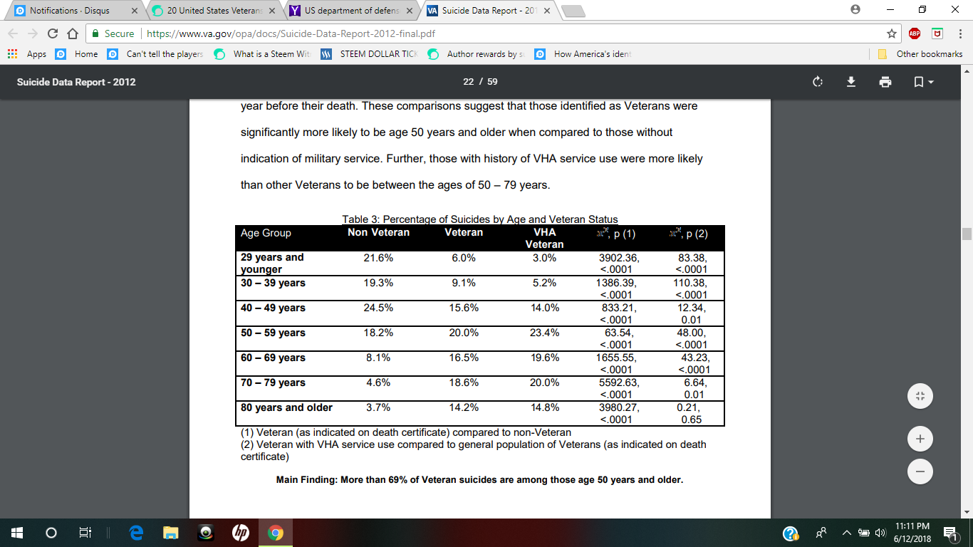 Here's a screen shot that shows you that 69% of men who served in the military committed suicide after the age of fifty, that's thirty some plus years AFTER they served, if the military was the reason most these guys committed suicide they'd done it a lot sooner, just like the articles I posted told you. Also compared to the fact that out of 79% of male suicides who did not serve 44% of those men were also over the age of fifty. Which draws a pretty close alliance that most men will commit suicide after the age of fifty and it's other things other than military service that drives them to do it. The report also REPEATEDLY states you cannot draw anything conclusive from the report because it based on statics from only 21 states that responded to the study, that the indication on death certificates that one served in the military didn't extinguish a difference between combat or non combat duty.