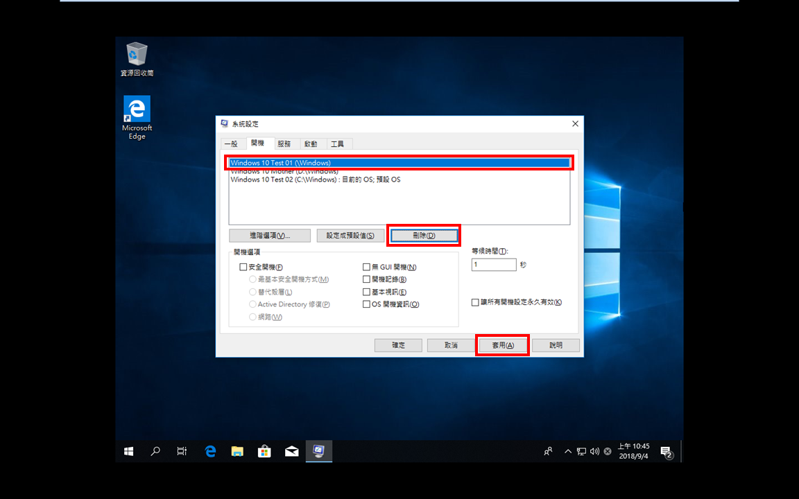 點選【Windows 10 Test 01 (\Windows)】→ 點選【刪除(D)】→ 點選【套用(A)】。