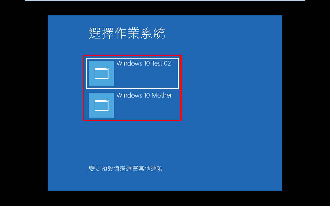 (13)可以看到開機選單只剩下:已設定成預設開機選項的「Windows 10 Test 02」以及「Windows 10 Mother」了。