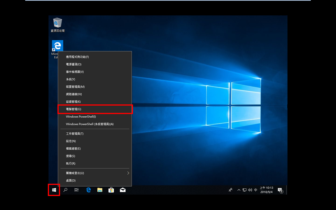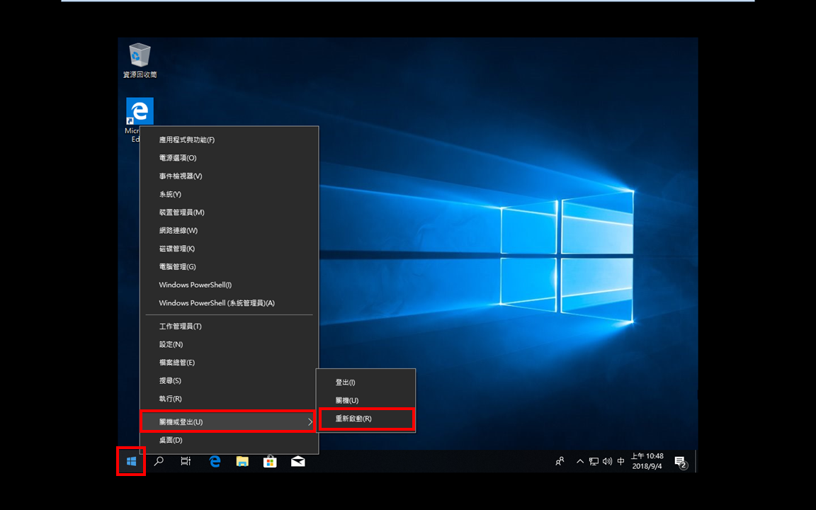 (12)在「視窗圖示」上點選【滑鼠右鍵】→【關機或登出(U)】→【重新啟動(R)】。