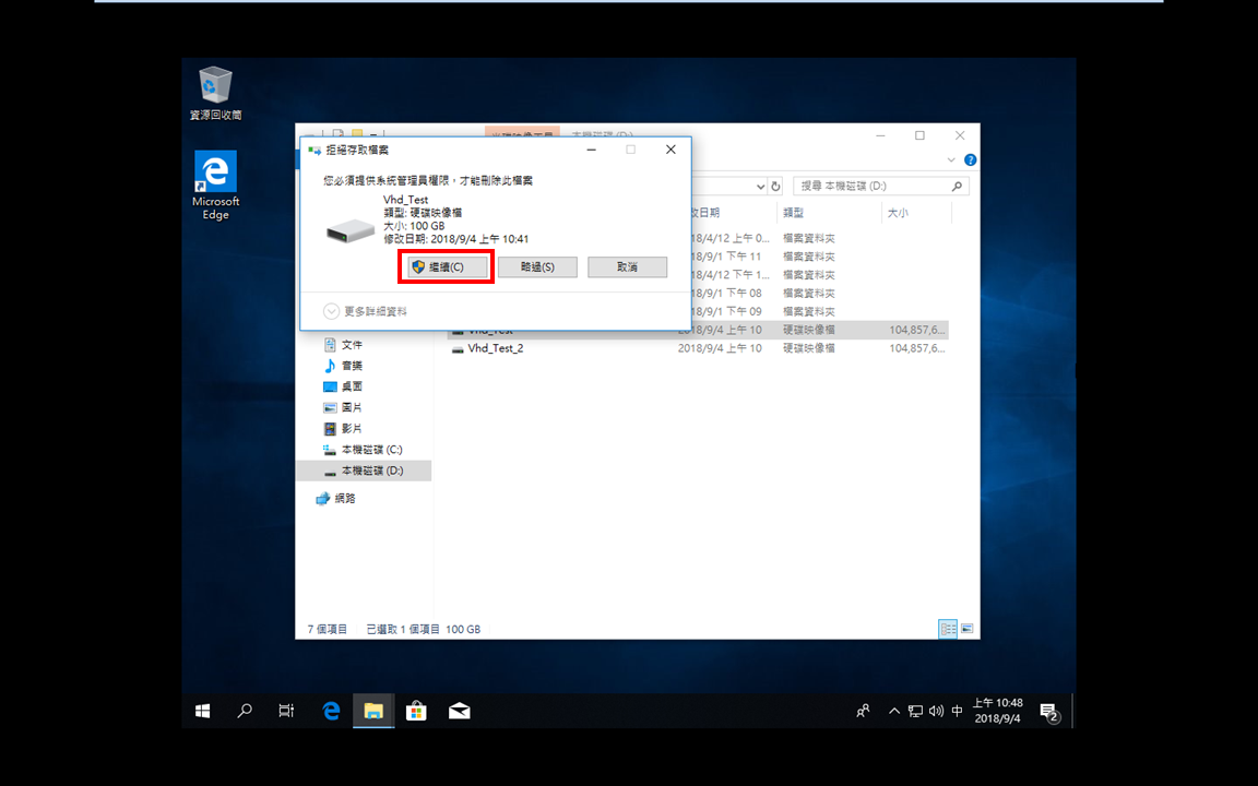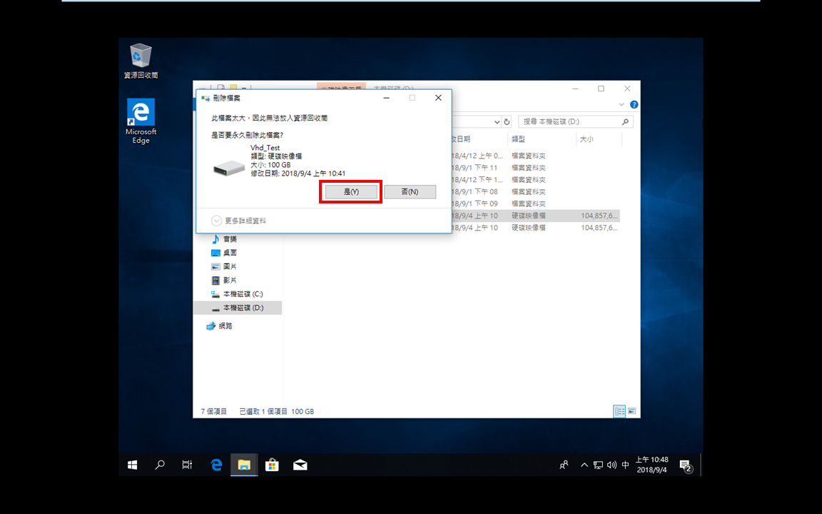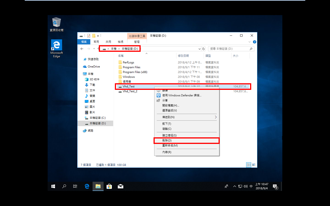 (8)在【本機/本機磁碟 (C:)】中,在「Vhd_Test.vhd」檔上按【滑鼠右鍵】→【刪除(D)】。