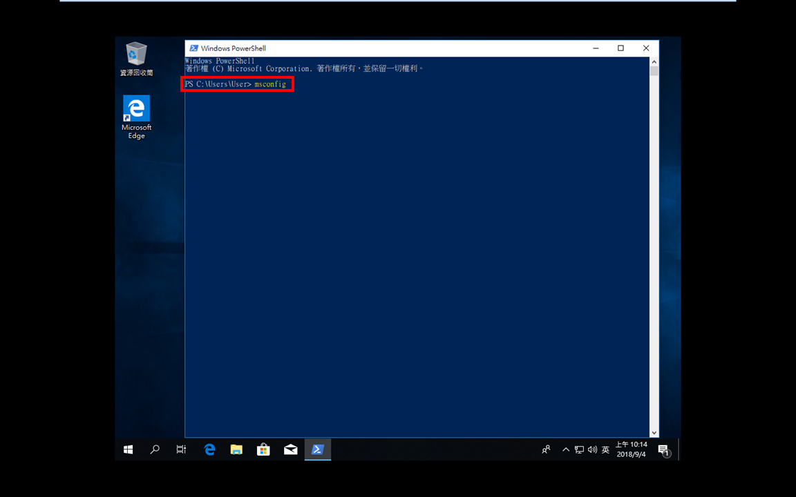 (2)此時會開啟 powershell.exe 程式,輸入【msconfig】後 → 按下鍵盤【Enter】鍵。
