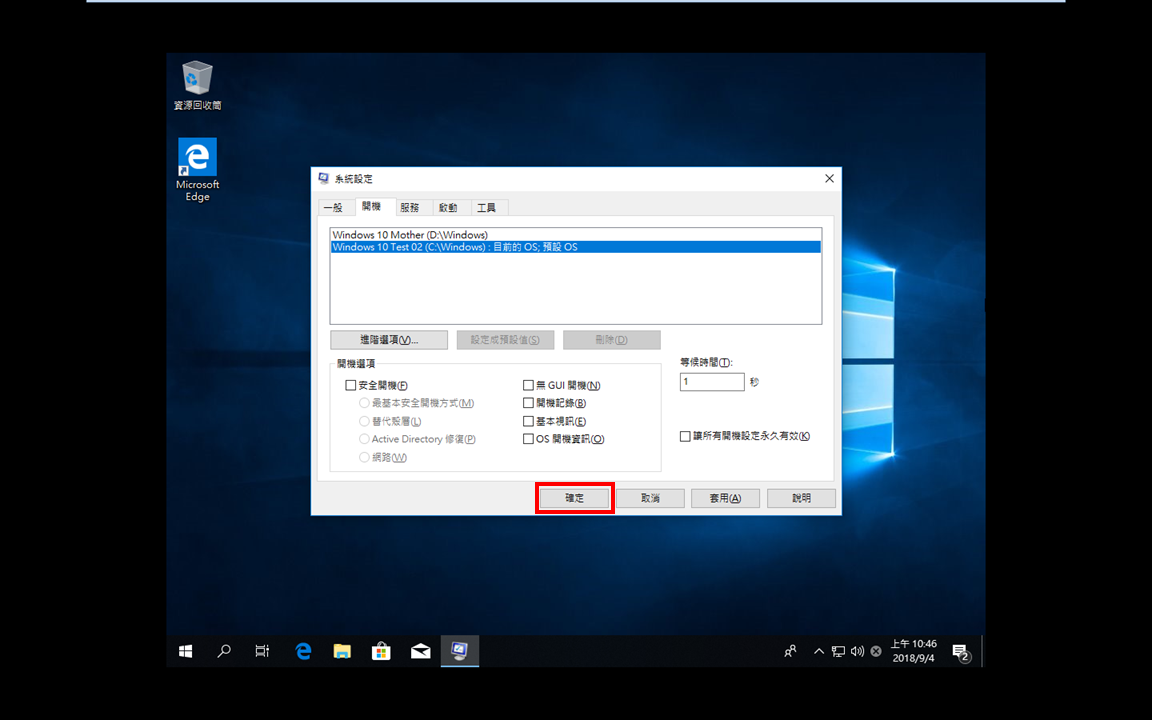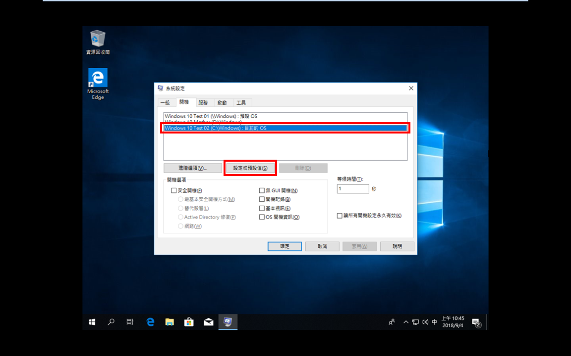 點選【Windows 10 Test 02 (C:\Windows):目前的 OS】→ 點選【設定成預設值(S)】→ 點選【套用(A)】。