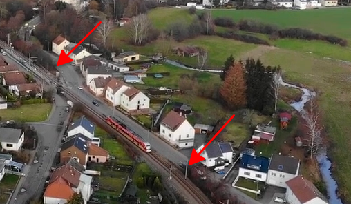 Das dürfte nicht so einfach sein. Rechts und links der Bahn sind nur Bäume, Sträucher und Privatgrundstücke. Ein 5-Sek.-Stück wäre an einer Stelle möglich, aber man müsste direkt über der Hauptstraße vor den Häusern fliegen. Nur eine Frage der Zeit bis einer die Polizei ruft. Die Bahn ist dort auch keine Tram, sondern eine Eisenbahn. Per Gesetz wären 100 m Abstand angesagt. Nee...