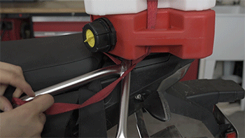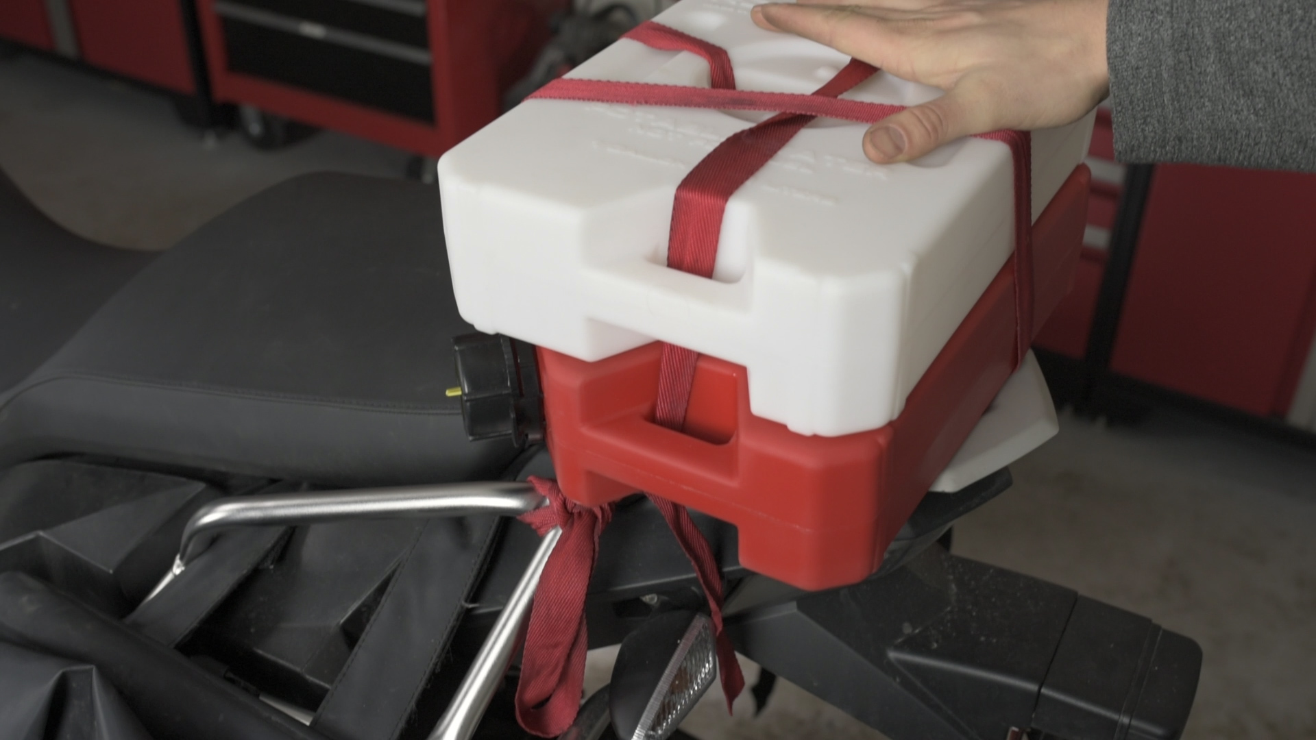 Splice the quick disconnect into your fuel line, and store the plastic tubing under the seat. If you run out of gas, it’s the old suck and siphon to pull fuel from a passerby. But the real magic happens when you’re playing saviour. Yank the disconnect, attach the tubing and flick the ignition.