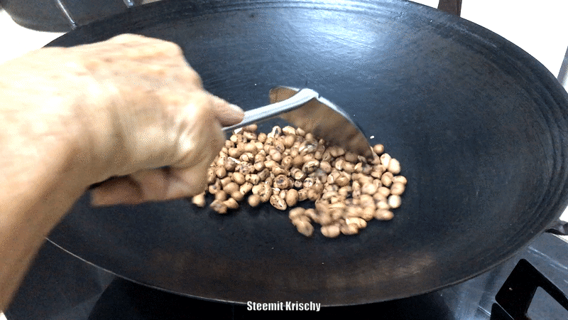 Step 1. Heat up your wok over low heat, and make sure it’s completely dry. Add peanut. Keep stirring continuously for about 5 minutes until the outsides start to get darker and the peanuts get really fragrant.(no oil is needed in this step)