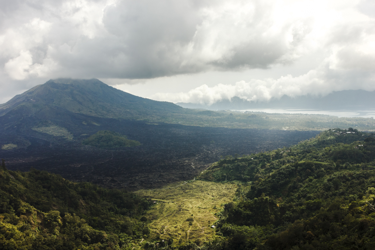 Also one of the first visitors we came to breakfast in the famous institution of Batur Sari with a huge view of the volcano Gunung-Batur and the same-named lake of Batur. The look was really huge and, as usual in such cases, say - the photo does not transmit. However, if you look carefully, you will see the roofs of small houses in the valley, which will help to assess the scale of what is happening.