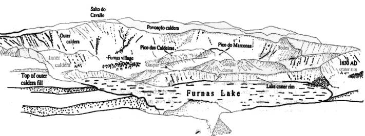 Furnas contains at least two calderas, a younger one that is 6-km wide and a larger older one that is less topographically distinct. Volcanic activity at Furnas dates back about 100,000 years. Two historical eruptions have occurred at Furnas, one sometime between 1439 and 1443 and the other in 1630. The latter was one of the largest Holocene explosive eruptions in the Azores and caused significant damage and fatalities.