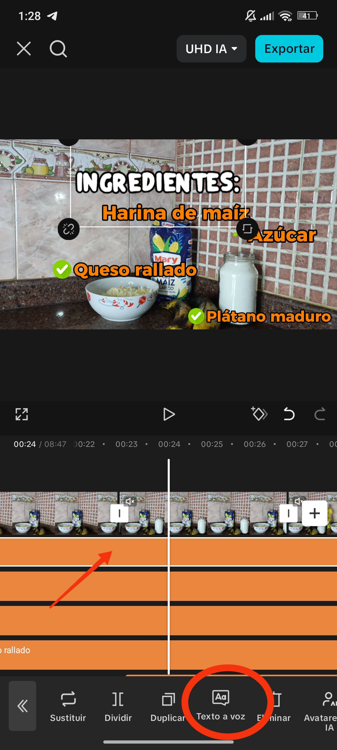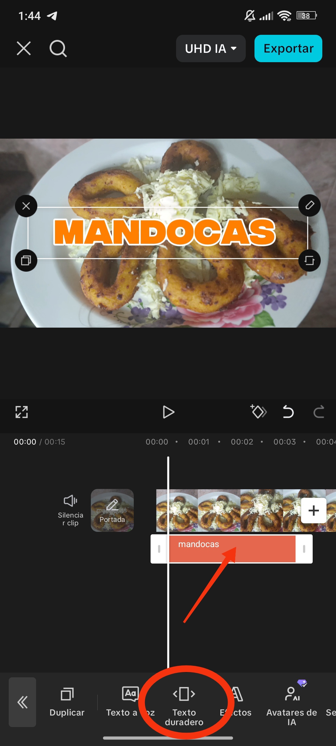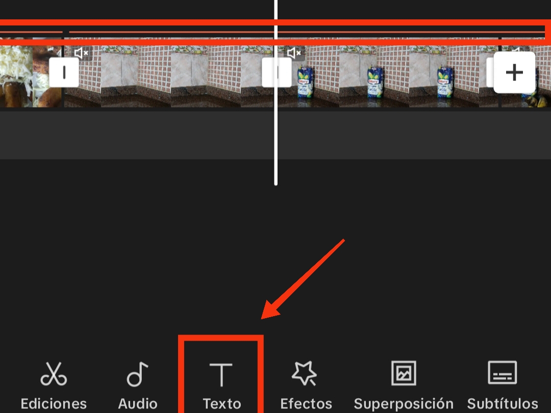 Una vez seleccionado el texto, se agrega a nuestra línea de tiempo. Para ver los textos en nuestra línea de tiempo, debemos estar en el apartado de texto; de lo contrario, simplemente lo veremos como una pequeña línea naranja.