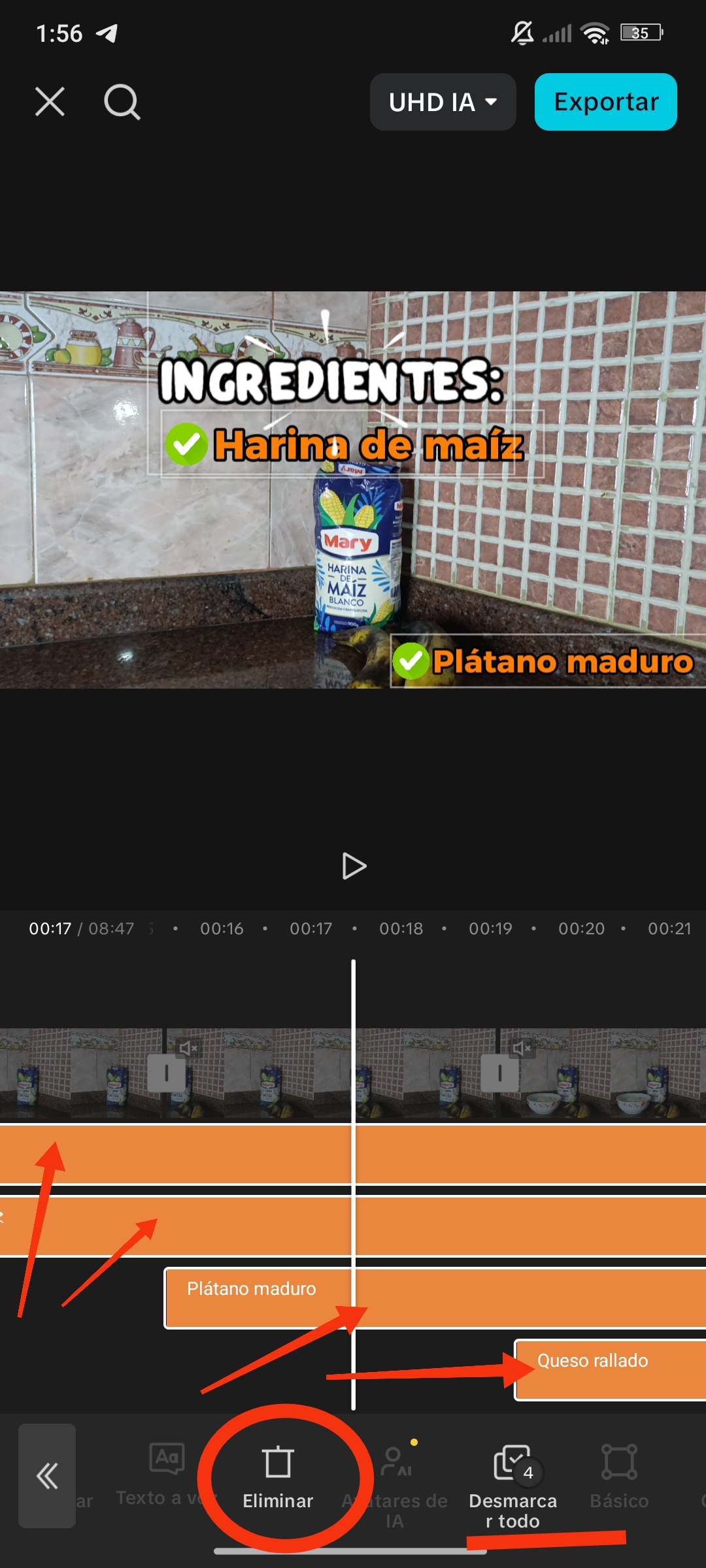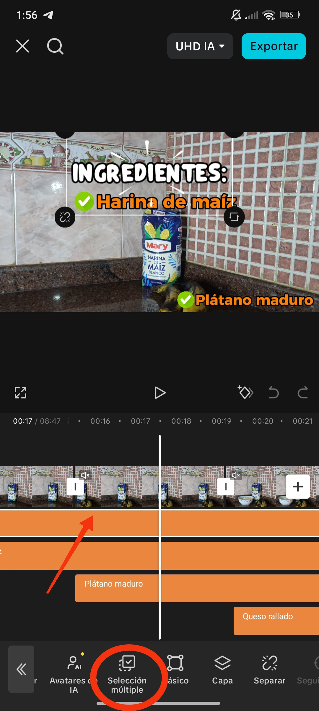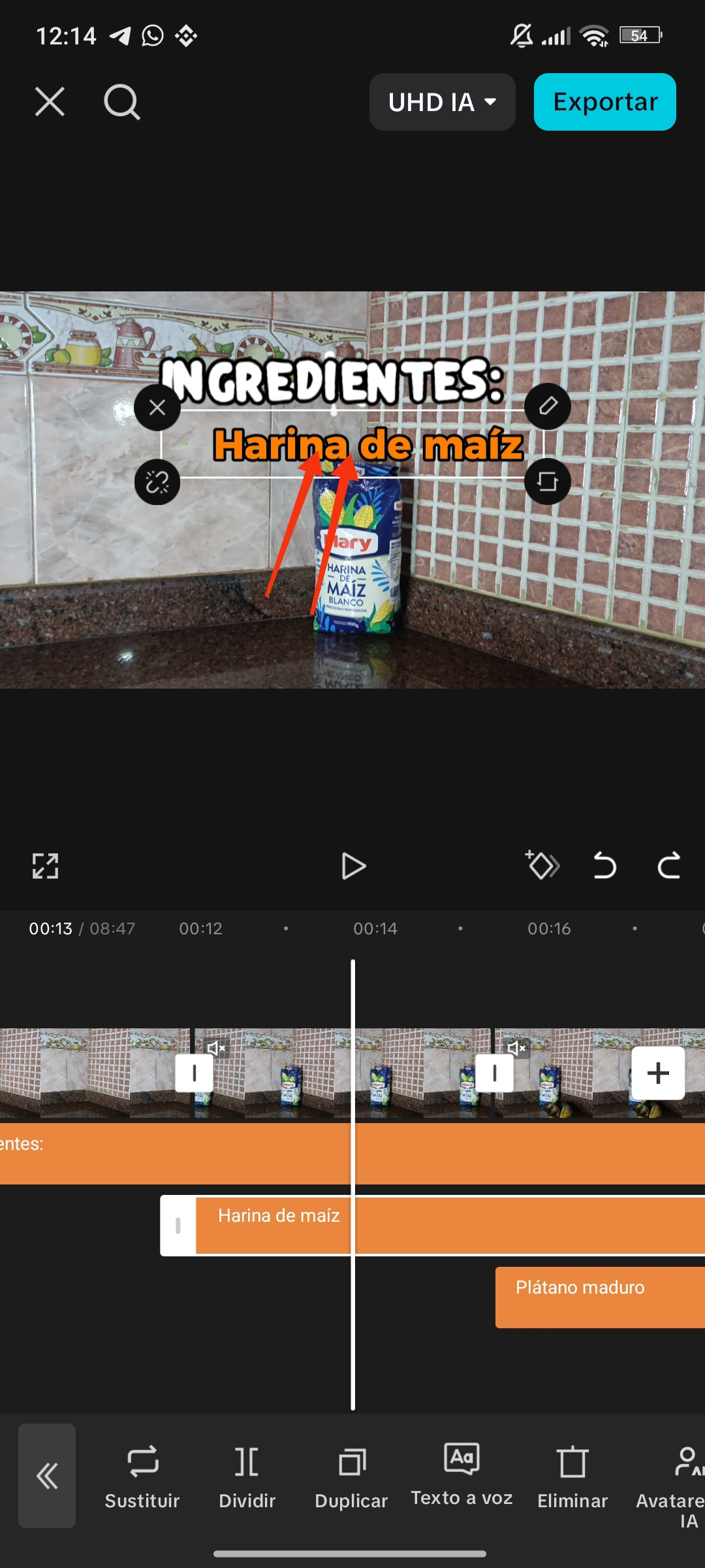 Una vez seleccionado el texto, se agrega a nuestra línea de tiempo. Para ver los textos en nuestra línea de tiempo, debemos estar en el apartado de texto; de lo contrario, simplemente lo veremos como una pequeña línea naranja.
