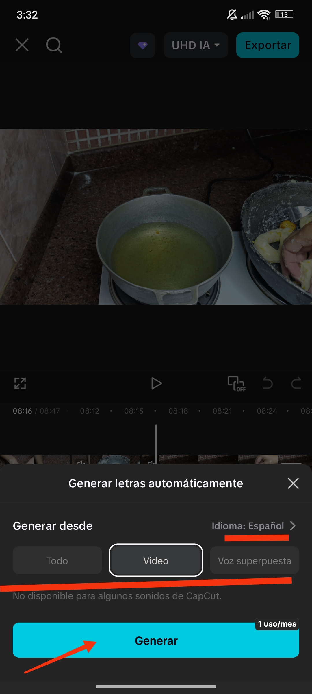 Automáticamente se selecciona la opción de voz superpuesta, vídeo o todo, y damos a "Generar". Así se generará un nuevo clip.