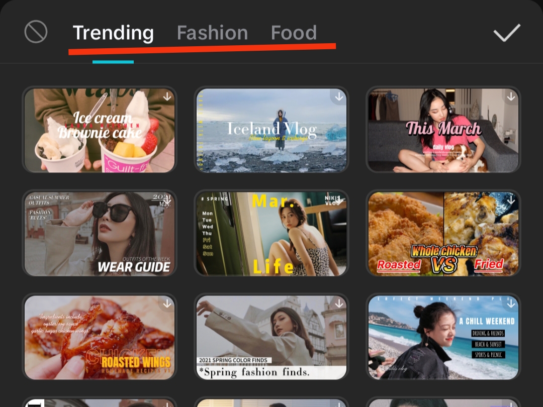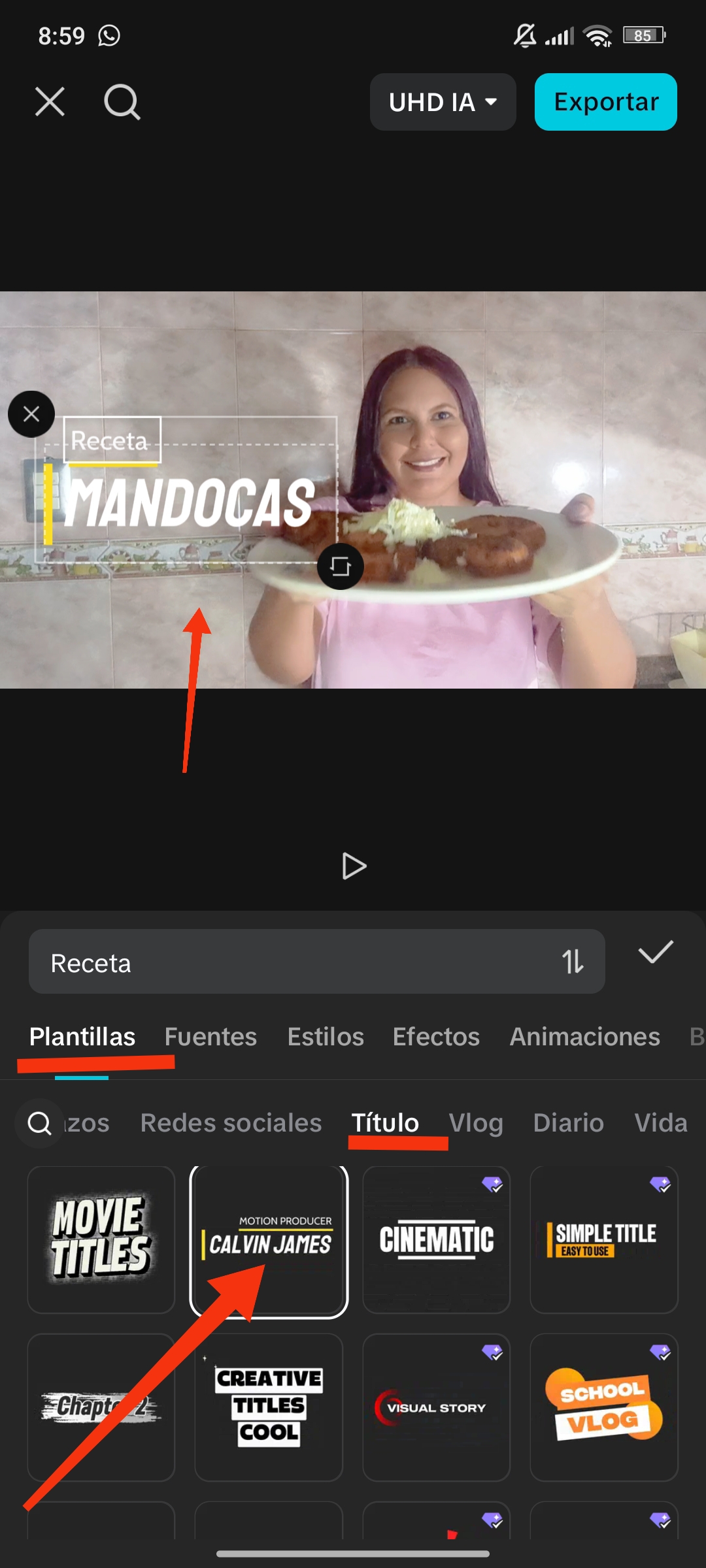 Las plantillas, como su nombre indica, son diseños con fuente y animación ya predeterminadas. Al seleccionar una, puedes previsualizar cómo quedará con tu texto escrito. Estas están divididas en categorías como: redes sociales, títulos, blogs, diarios, vida, viaje y maquillaje. Puedes seleccionar la que mejor se adapte a tu video.