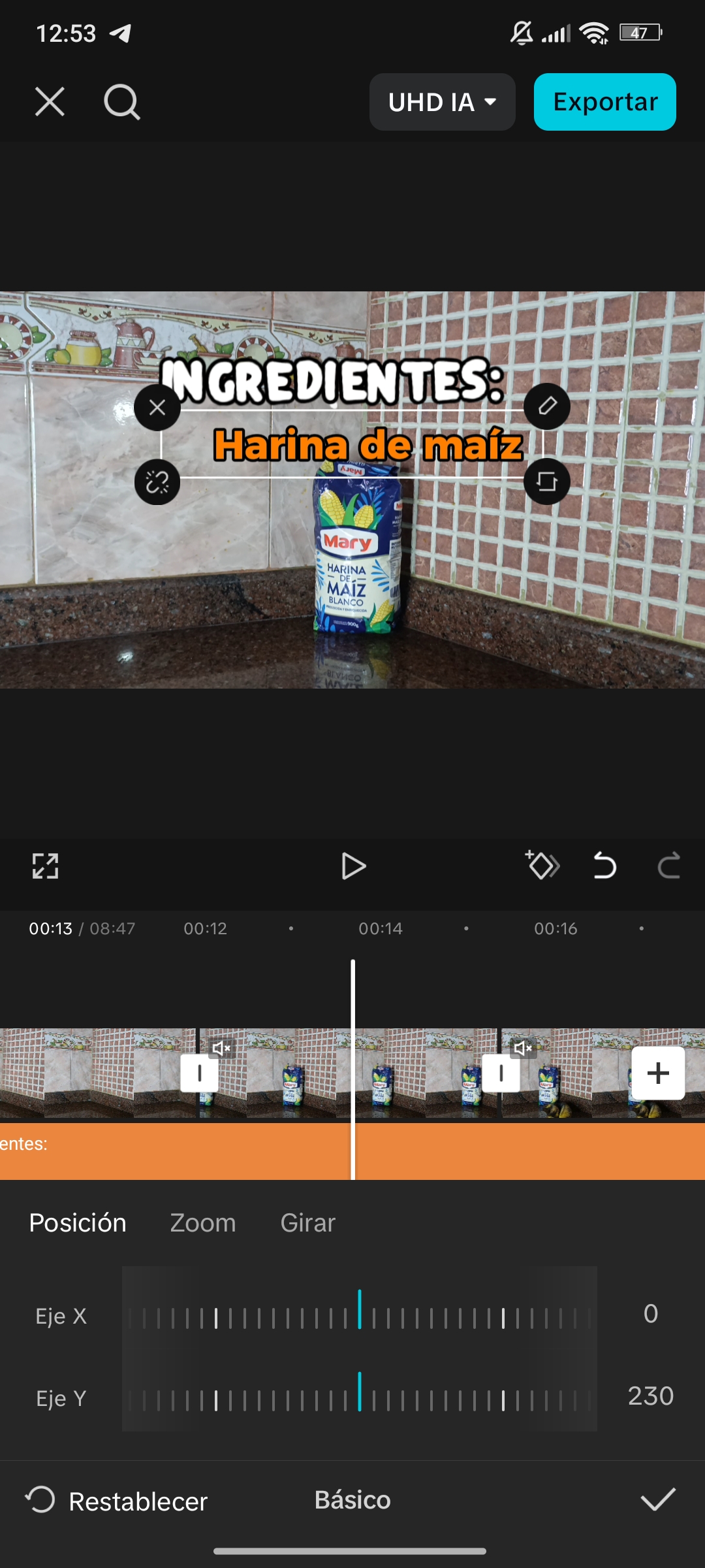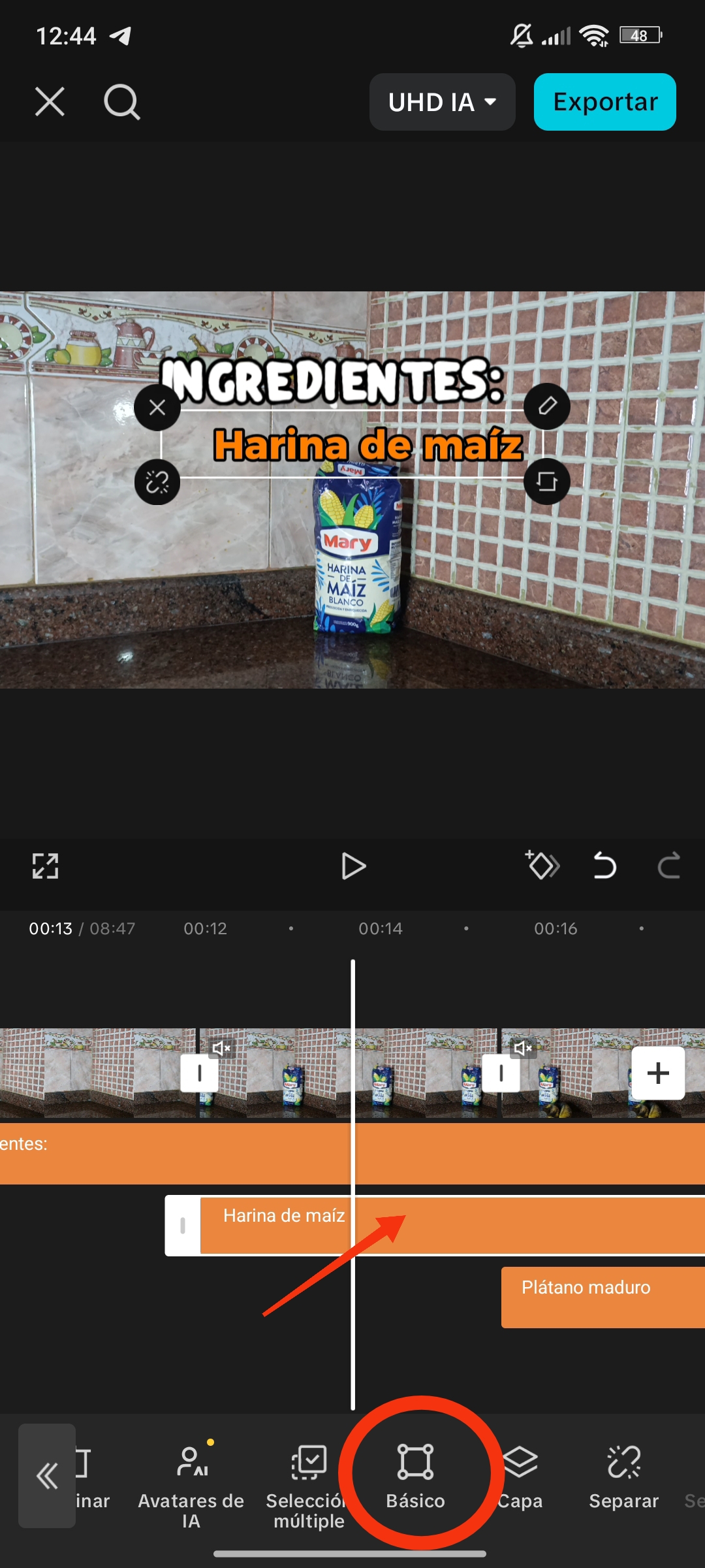 Esto también lo podemos hacer en el ícono de "Básico", que está ubicado casi al final del menú haciendo clip al texto de la linea de tiempo.