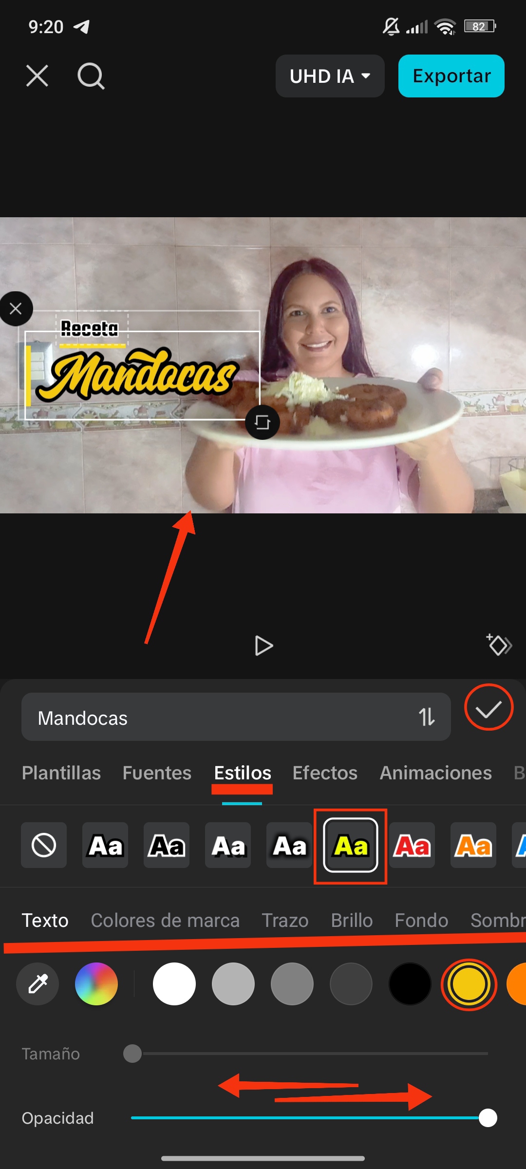Al hacer clic en "Estilo", se mostrarán opciones ya predeterminadas. Puedes seleccionar o simplemente cambiar el color, el trazo, brillo, sombra, fondo, espacio, minúsculas o mayúsculas, entre otras modificaciones.