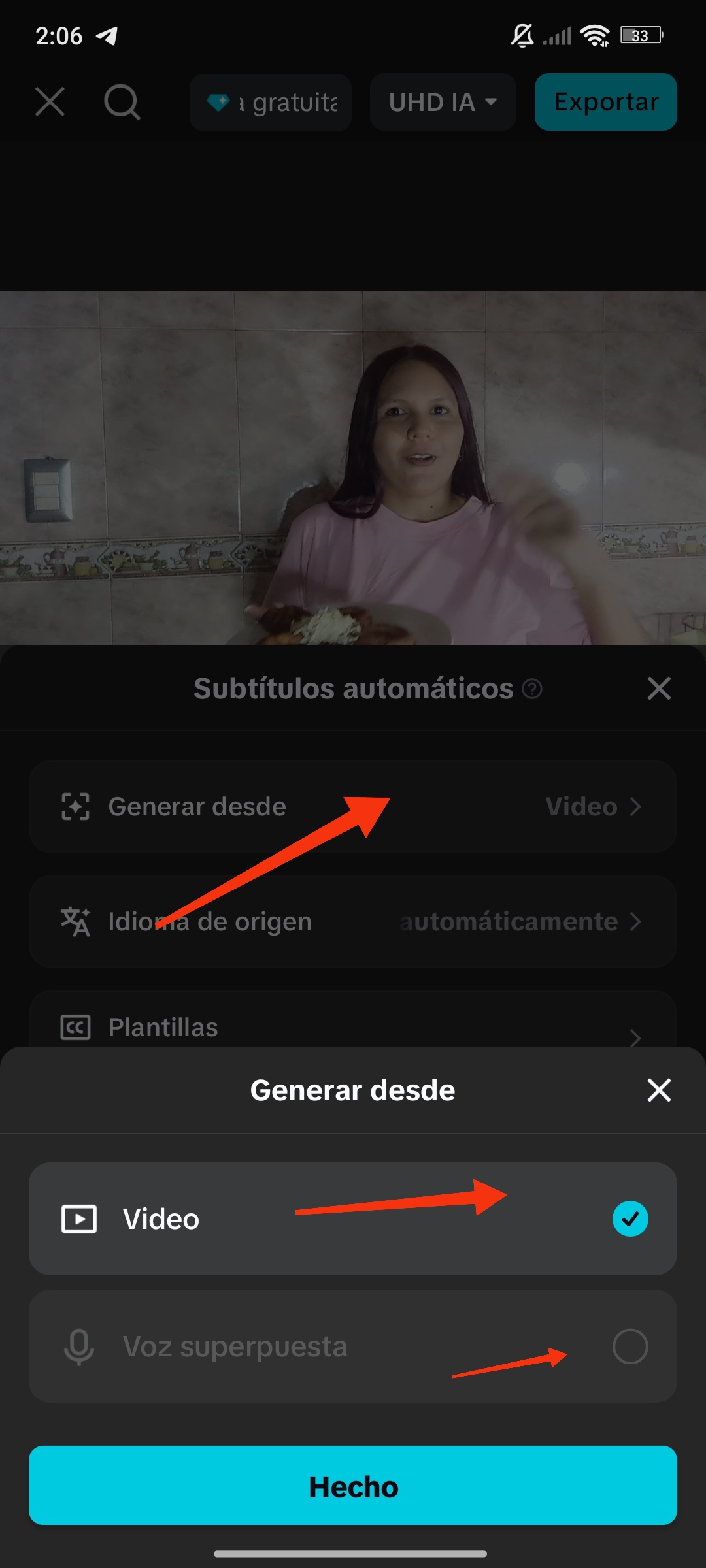 Al hacer clic en "Generar desde", tenemos la opción de video o voz superpuesta. Seleccionamos la de nuestra preferencia y hacemos clic en "Hecho".