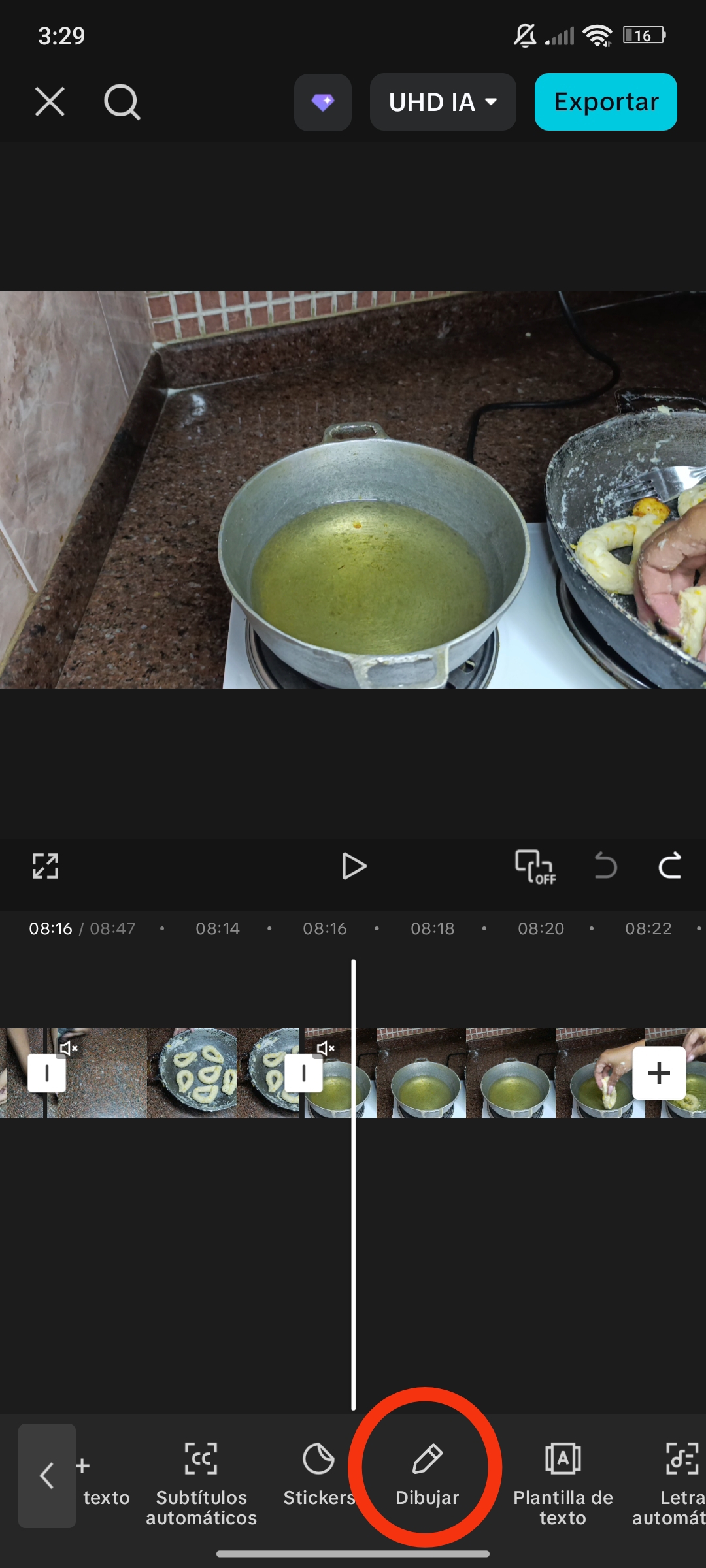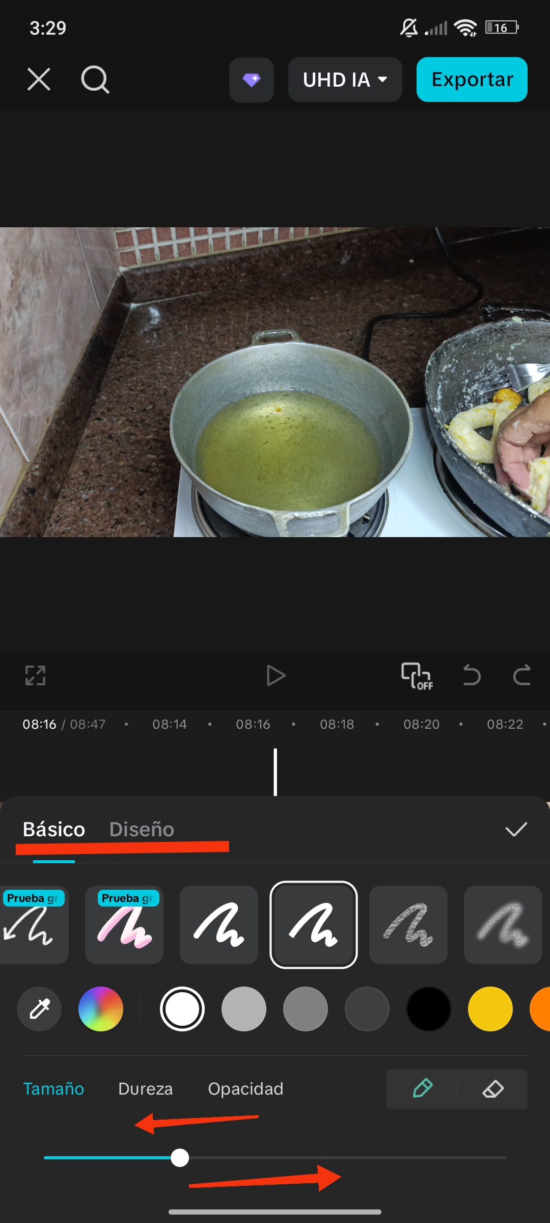 En esta opción, podemos dibujar lo que deseamos; el ícono lo encontramos en el menú de texto. Al hacer clic, se nos muestra la opción de seleccionar el diseño del trazo, color, tamaño y opacidad. También tenemos la opción de borrar.