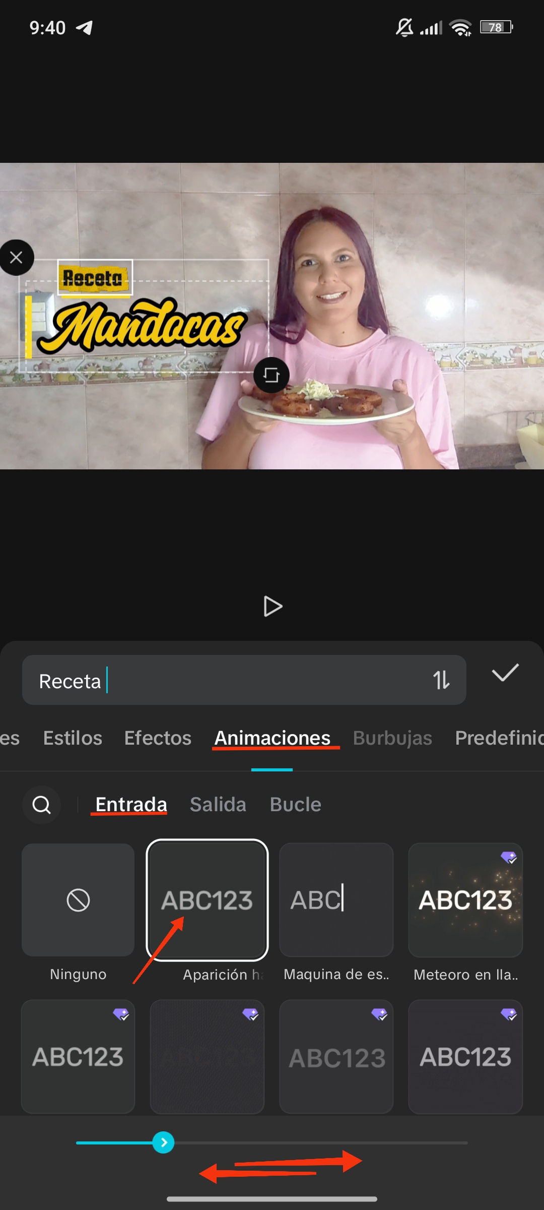 La animación de entrada es la que inicia cuando aparece el texto. Al hacer clic en una de estas animaciones, puedes modificar el tiempo de inicio.