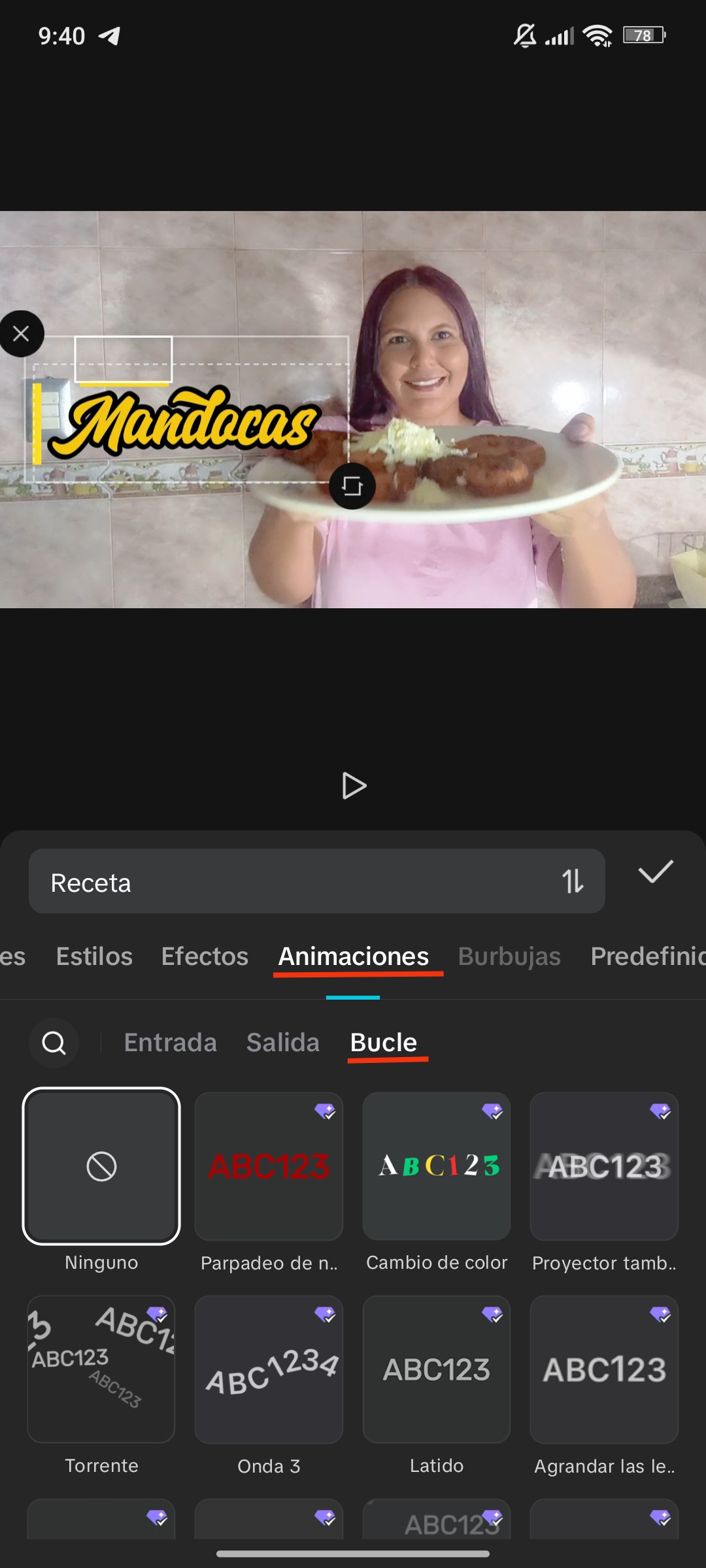 La animación de bucle es la que se ejecuta durante el tiempo que aparezca el texto. Al hacer clic en una de estas animaciones, puedes modificar la velocidad de la misma.