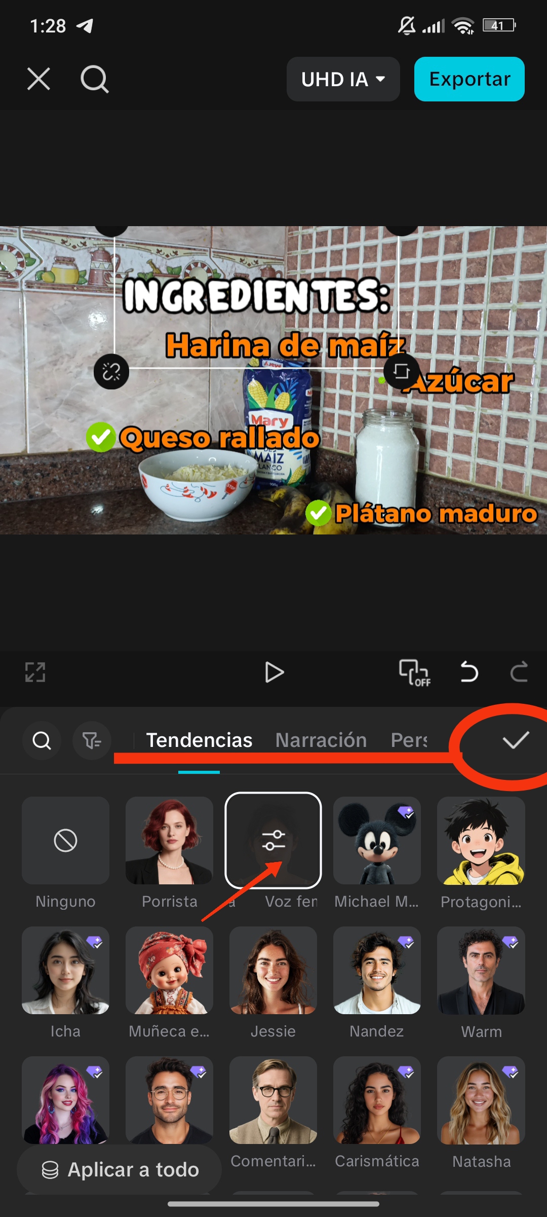 Al hacer clic en uno de los textos , nos sale esta opción en el menu, al dar clic se abre una nueva ventana con opciones de voz disponibles . Si nos gustaría aplicar, seleccionamos ✅ . aparece en nuestra línea de tiempo al hacer clic en "Colección de sonidos".