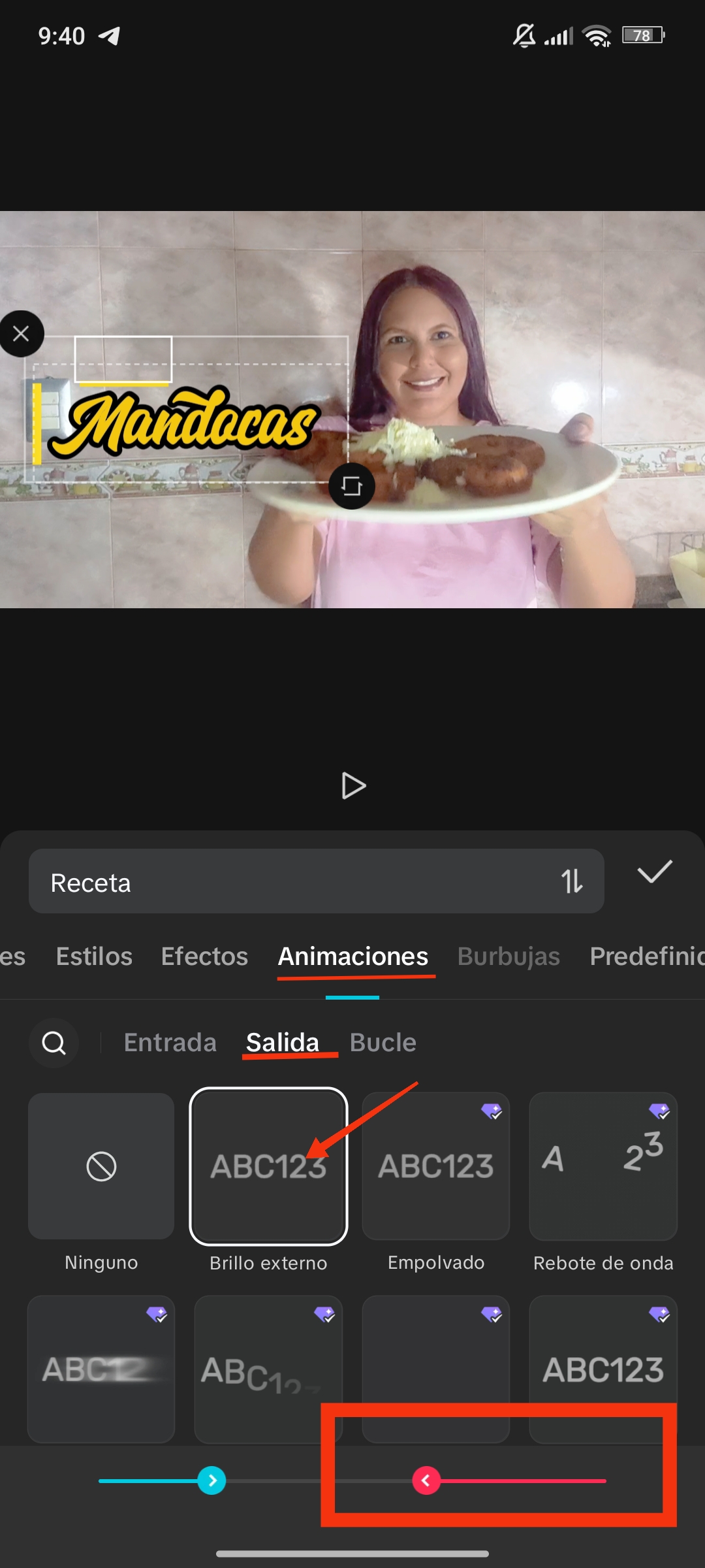 La animación de salida es la que se realiza antes de finalizar el texto. Al hacer clic en una de estas animaciones, puedes modificar el tiempo de salida.