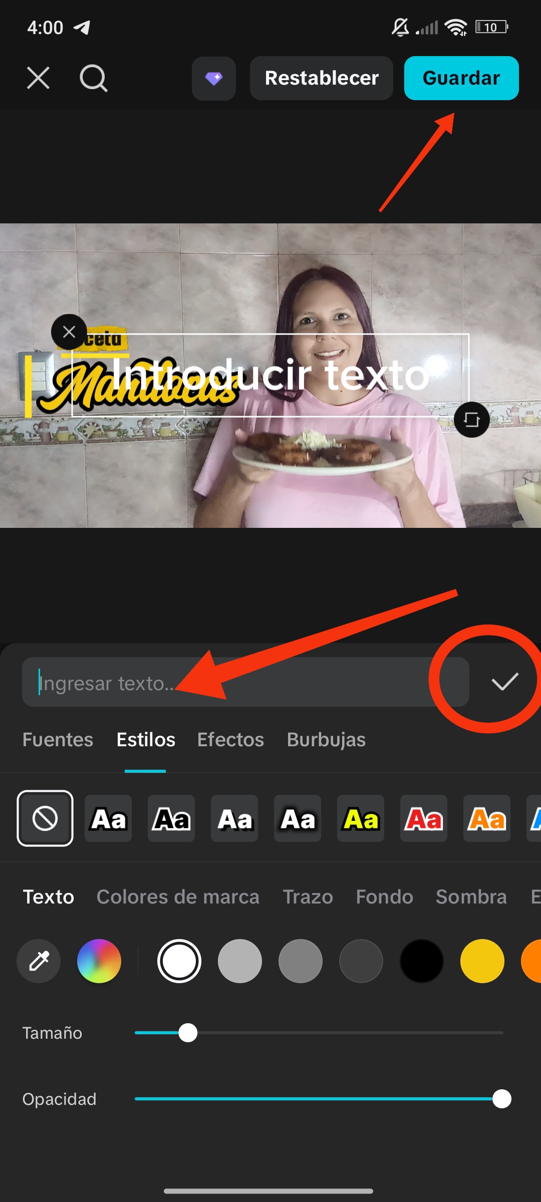 En el otro extremo, podemos seleccionarlo, agrandar el texto, minimizarlo, girarlo y moverlo de lugar.