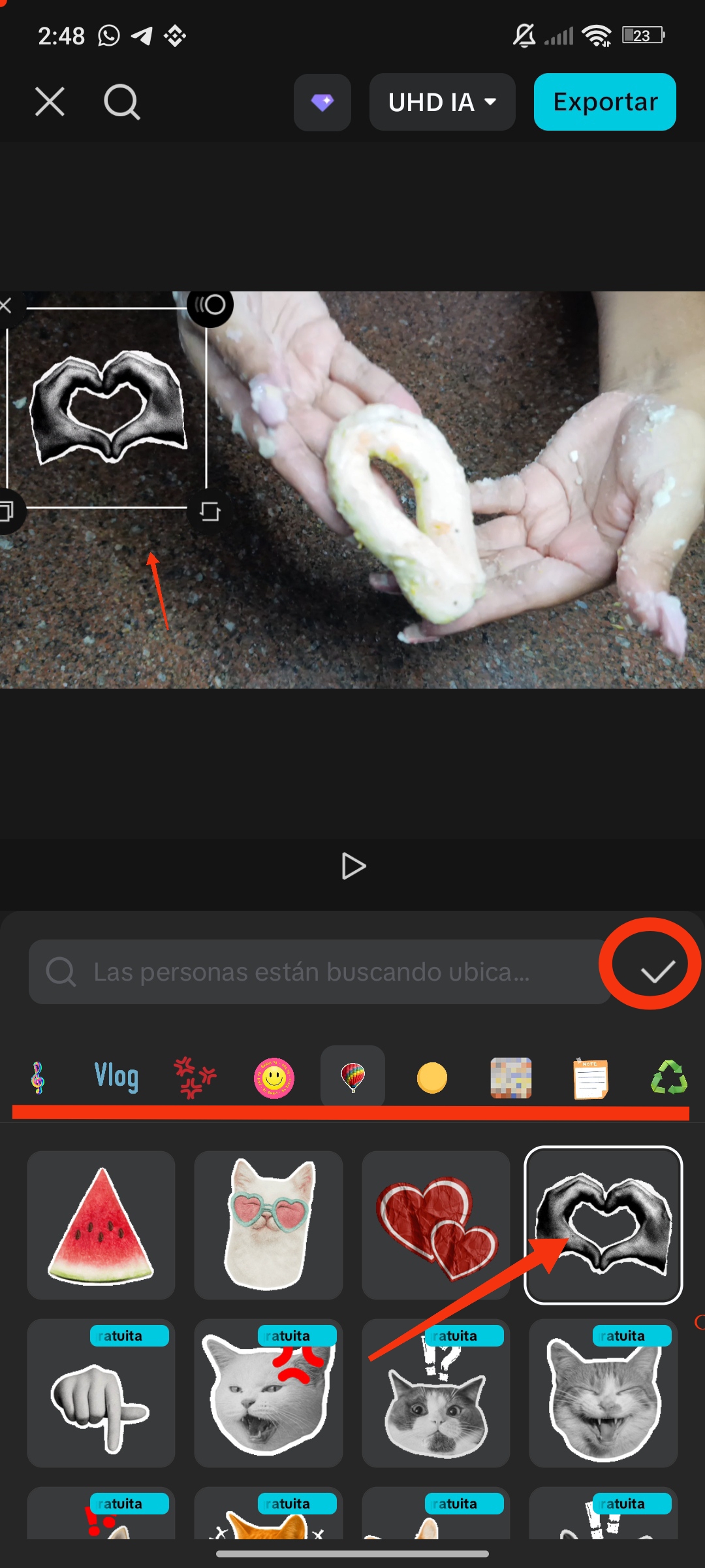 Al seleccionar, se nos presentan varios stickers por categoría. Puedes seleccionar uno para previsualizar y luego hacer clic en ✅ para aplicarlo a nuestro clip.