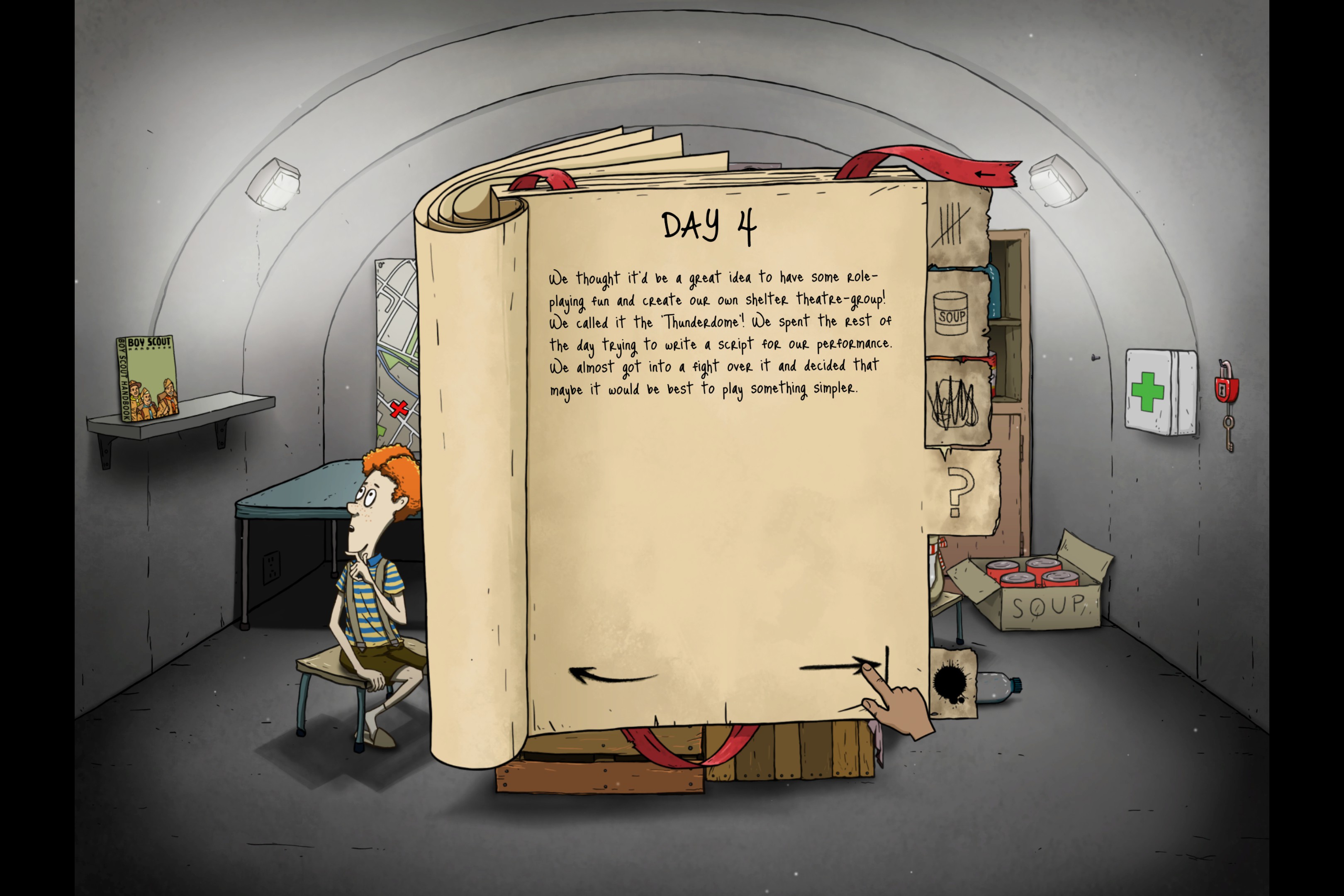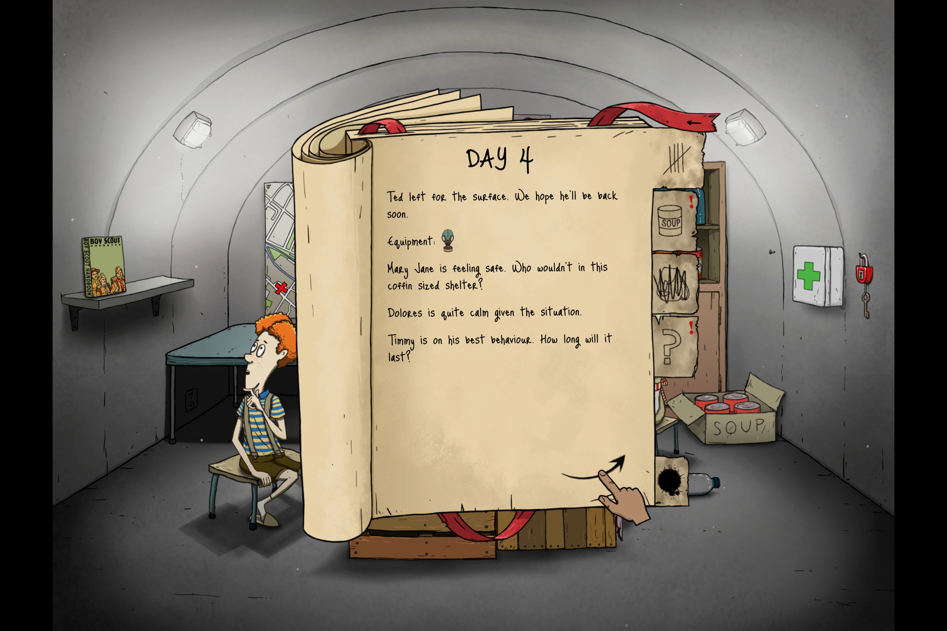 Day 4. Ted is still gone. Hopefully he brings back a radio or a rifle back from his scavanging trip.