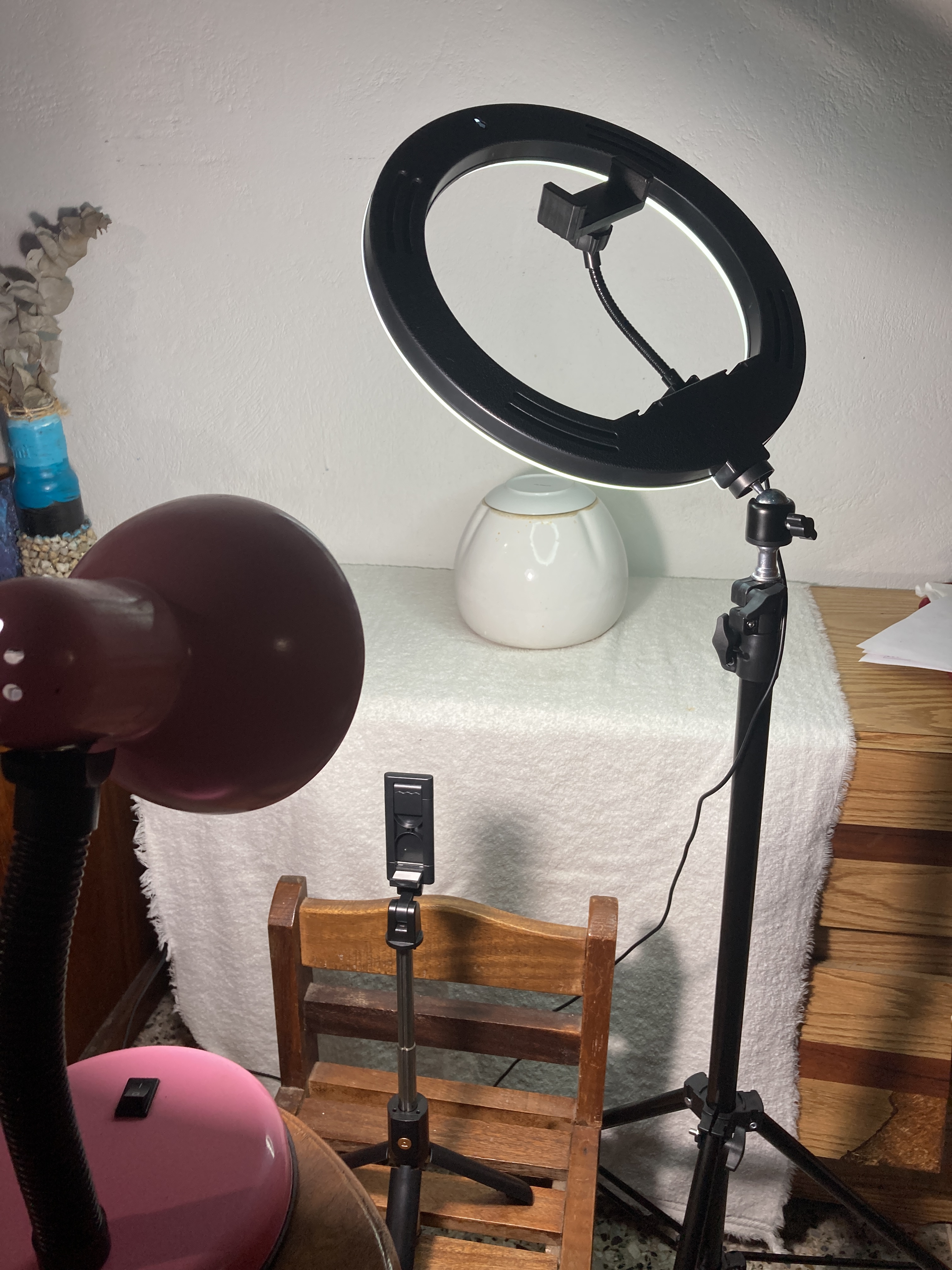 La imagen de al lado muestra las luces que utilicé; un aro de luz aereo, una lmapara de escritorio y un tripode para colocar el teléfono y sacar las fotos. Sumado a esto un fondo blanco de pared y una toalla como base para dar el fondo blanco.