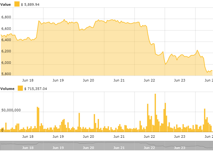 Bitcoin, trading at $5,881 currently, its decline since hitting its all-time-high of $20,000 in December 2017.
