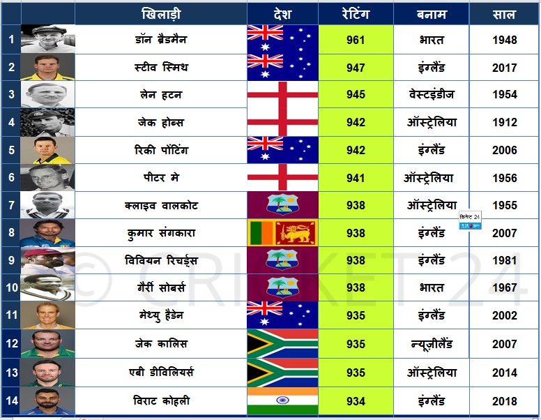 टेस्ट क्रिकेट इतिहास में सर्वाधिक रेटिंग अंक हासिल करने वाले बल्लेबाजों में विराट अब 14वें स्थान पर आ गए हैं। वह भारतीय इतिहास में सर्वश्रेष्ठ रेटिंग अंक हासिल करने वाले बल्लेबाज बन गए हैं। इससे पहले सुनील गावस्कर ने सर्वाधिक 916 रेटिंग अंक हासिल किए थे।