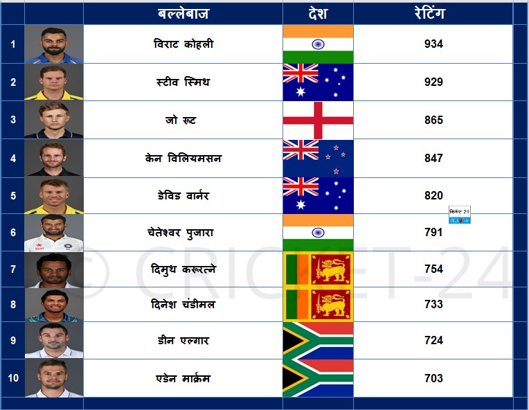 विराट ने ऑस्ट्रेलिया के स्टीव स्मिथ को पीछे छोड़ा है, जो की पिछले 8 महीने से शीर्ष स्थान पर काबिज थे। अन्य बल्लेबाजों में जो रूट तीसरे और भारत के चेतेश्वर पुजारा छठे स्थान पर बने हुए हैं।