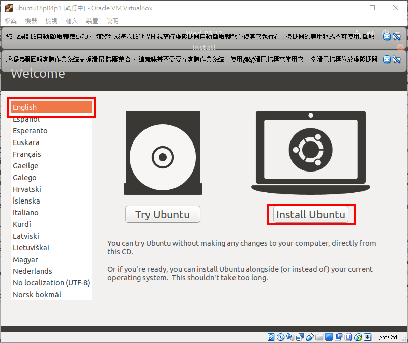 點選左側【English】→ 點選右側【Install Ubuntu】。