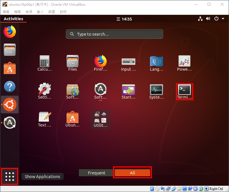 (4)點選左下角【Show Applications】→ 點選下方的【All】→【Terminal】。