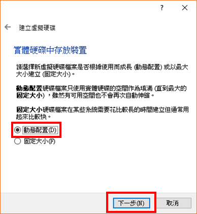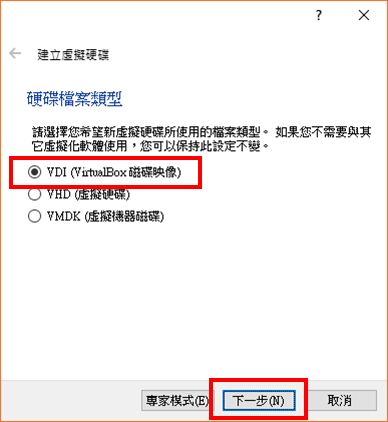 點選【VDI (VirtualBox 磁碟映像)】→ 點選【下一步(N)】。