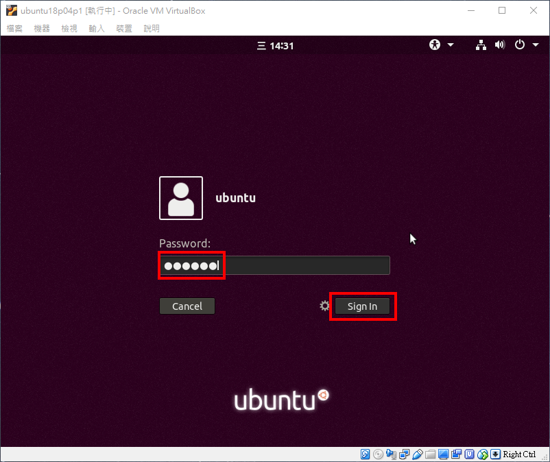 (2)輸入 ubuntu 使用者密碼【ubuntu】→【Sign In】。
