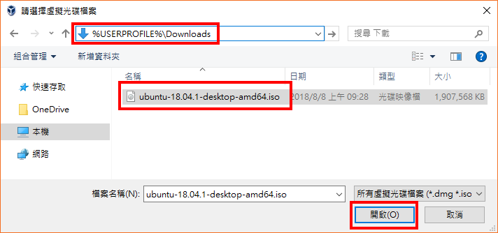 → 點選【ubuntu-18.04.1-desktop-amd64.iso】檔 →【開啟(O)】。