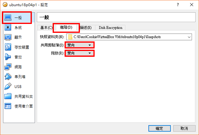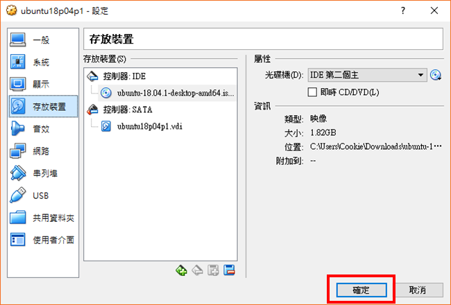 在 Windows 作業系統下虛擬機預設會放在:「%USERPROFILE%\VirtualBox VMs\ubuntu18p04p1」內。