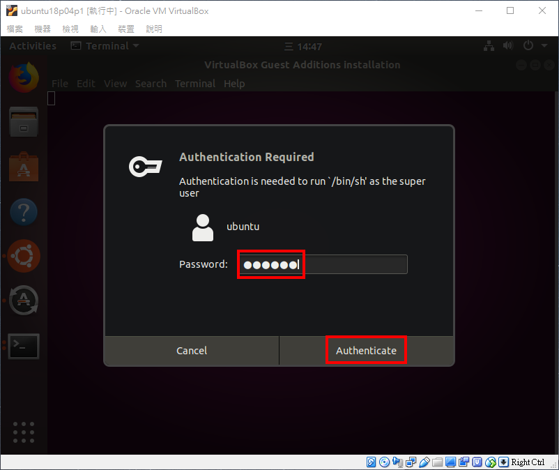 (8)輸入 ubuntu 使用者密碼【ubuntu】→【Authenticate】。