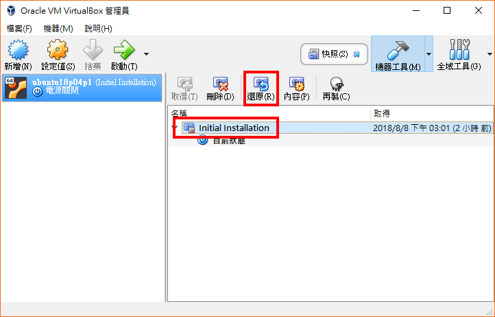 (4)未來若把虛擬機器搞壞了,仍可透過【還原(R)】快照將虛擬機器還原至目前狀態。