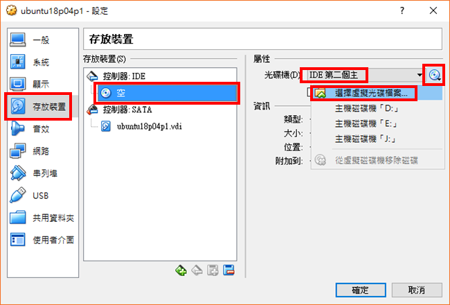點選左側【存放裝置】→ 點選「控制器: IDE」底下的【空】→