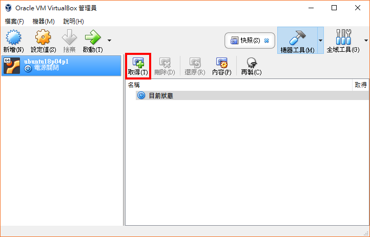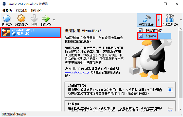 (1)點選左側【ubuntu18p04p1】虛擬機器 → 點選右側「機器工具(M)」右邊【鍵頭】→【快照(S)】。