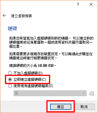 點選【立即建立虛擬硬碟(C)】→【建立】。